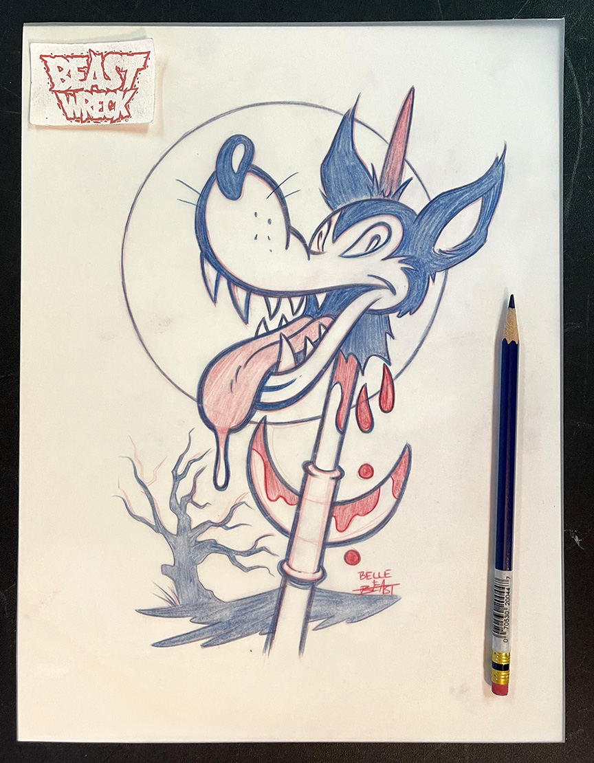 Original pencil drawing of the SLAUGHTERED LAMB (AN AMERICAN WEREWOLF IN LONDON) design by Belle Dee and BeastBoy on 9" x 12" Strathmore Tracing paper.