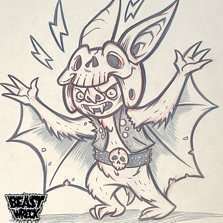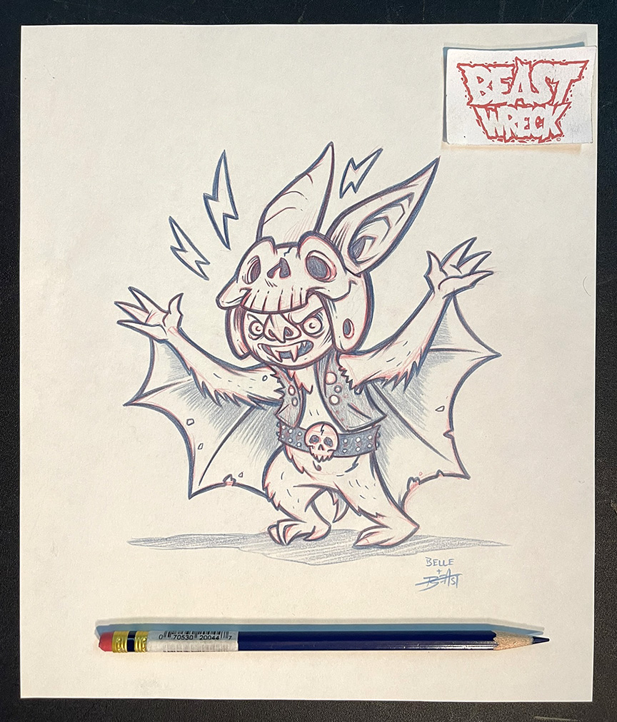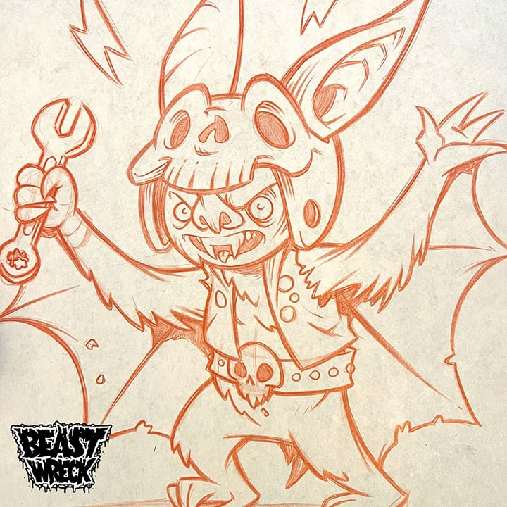 Original red colored pencil drawing of a BAT MECHANIC character done for a 'zine in 2021!
