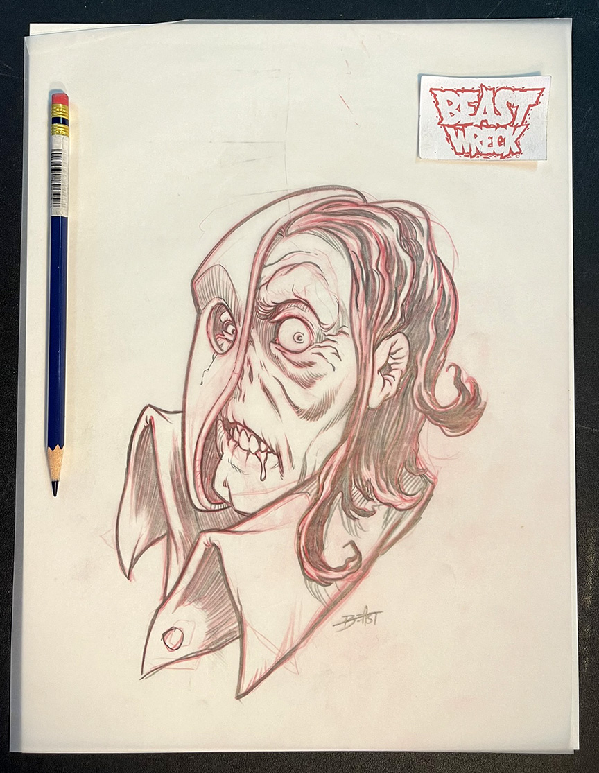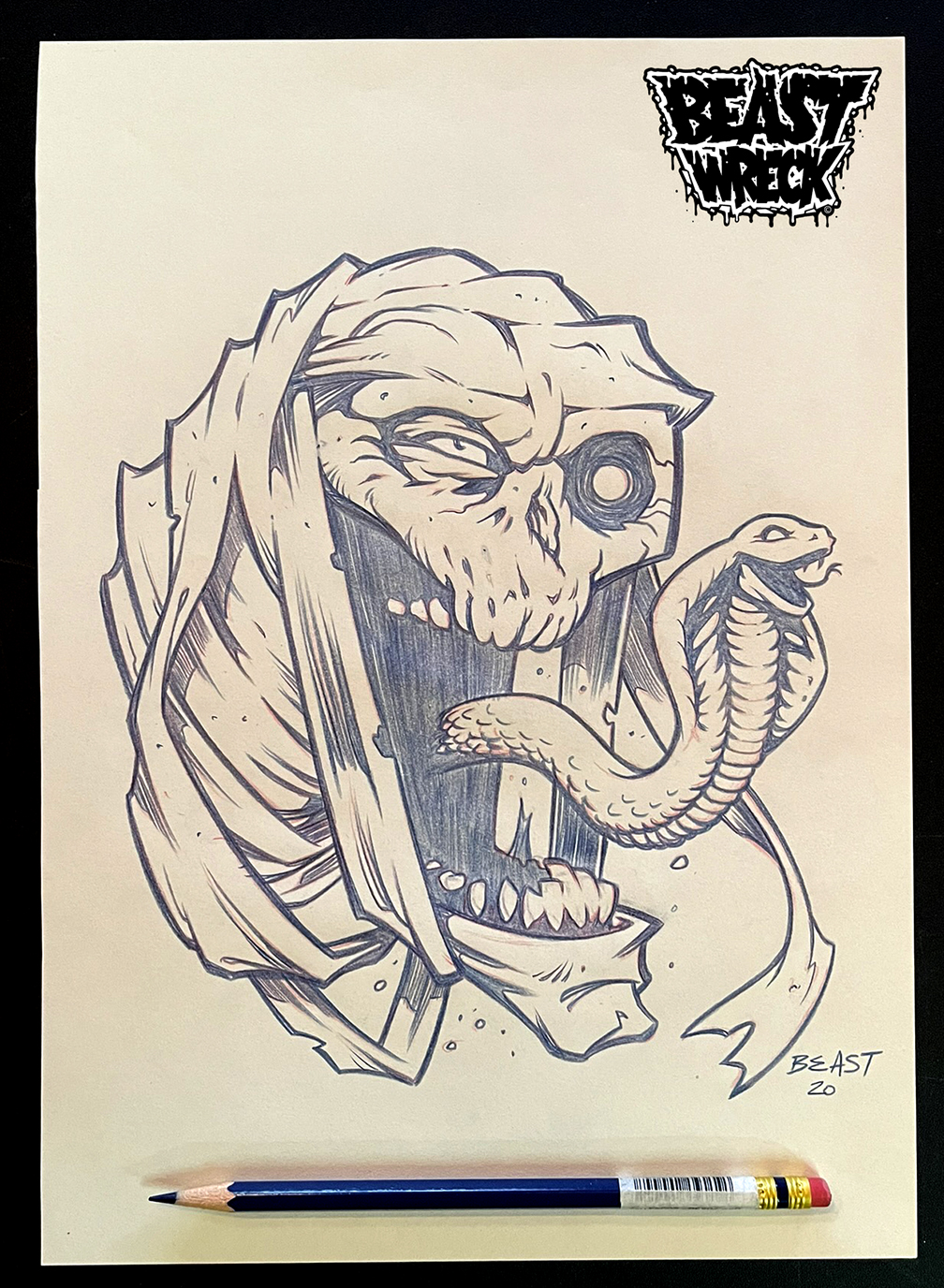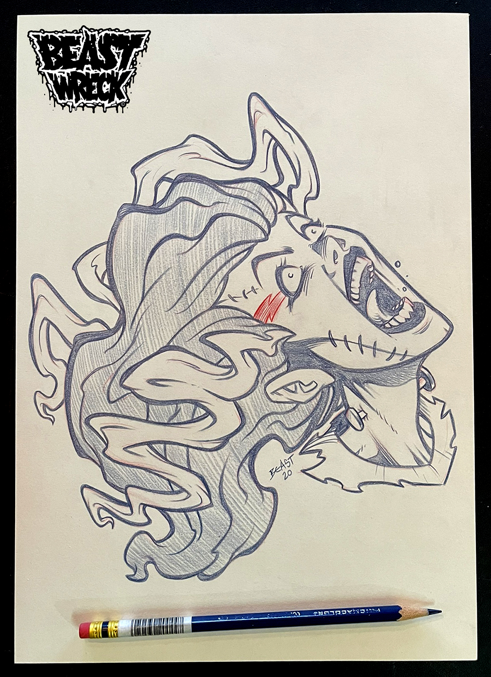 Original pencil drawings done for Beastwrecks set of MONSTER HEADS stickers from 2021