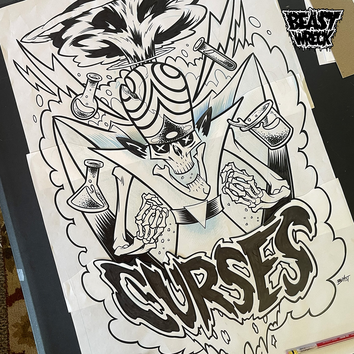 Original final ink artwork for the POWERPUFF GIRLS - MOJO JOJO: "CURSES" t-shirt design illustrated by BeastBoy on 19" x 28" Strathmore Marker paper.