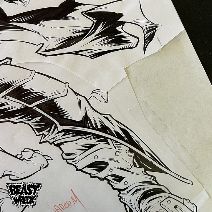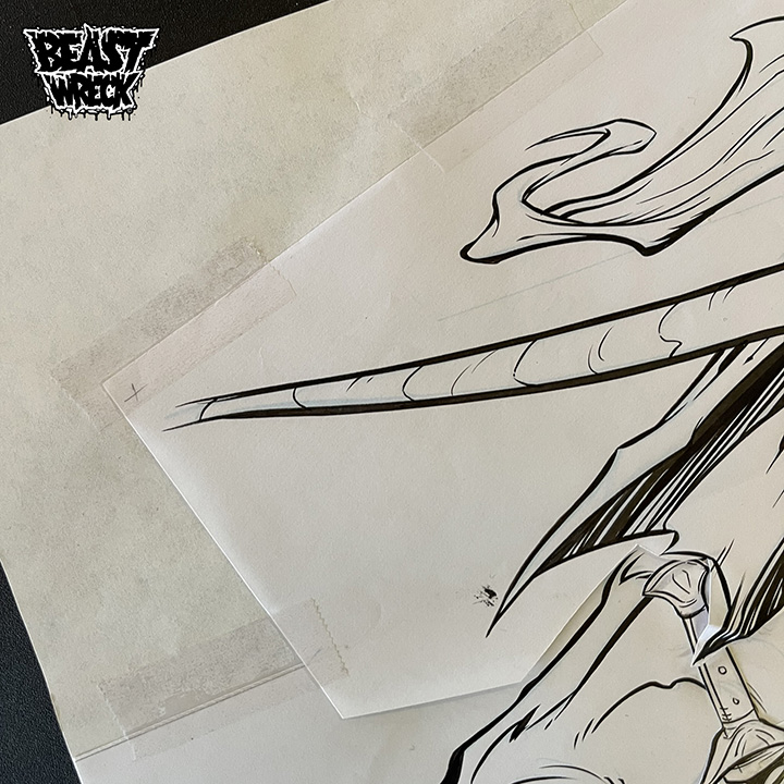 Ink artwork is Pen & brush on 18"x19" Marker Paper. Composite illustration made of 2 separate ink sheet segments cut and taped together (see pics for details).