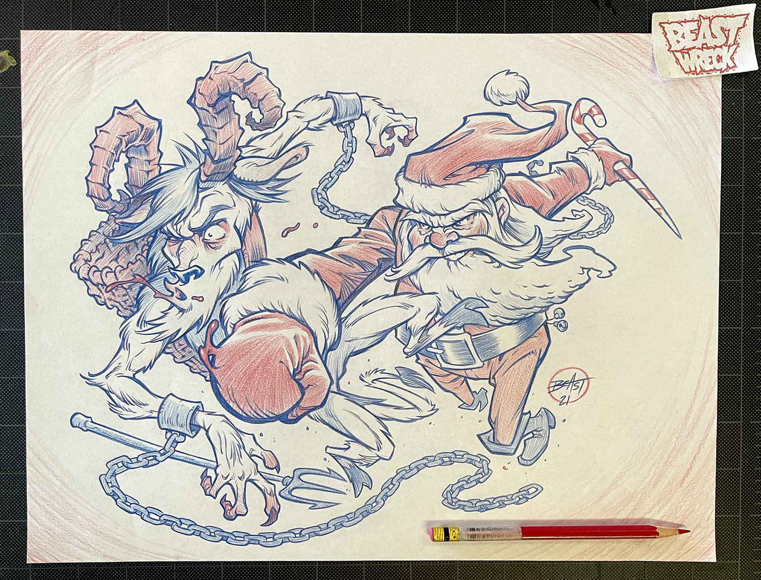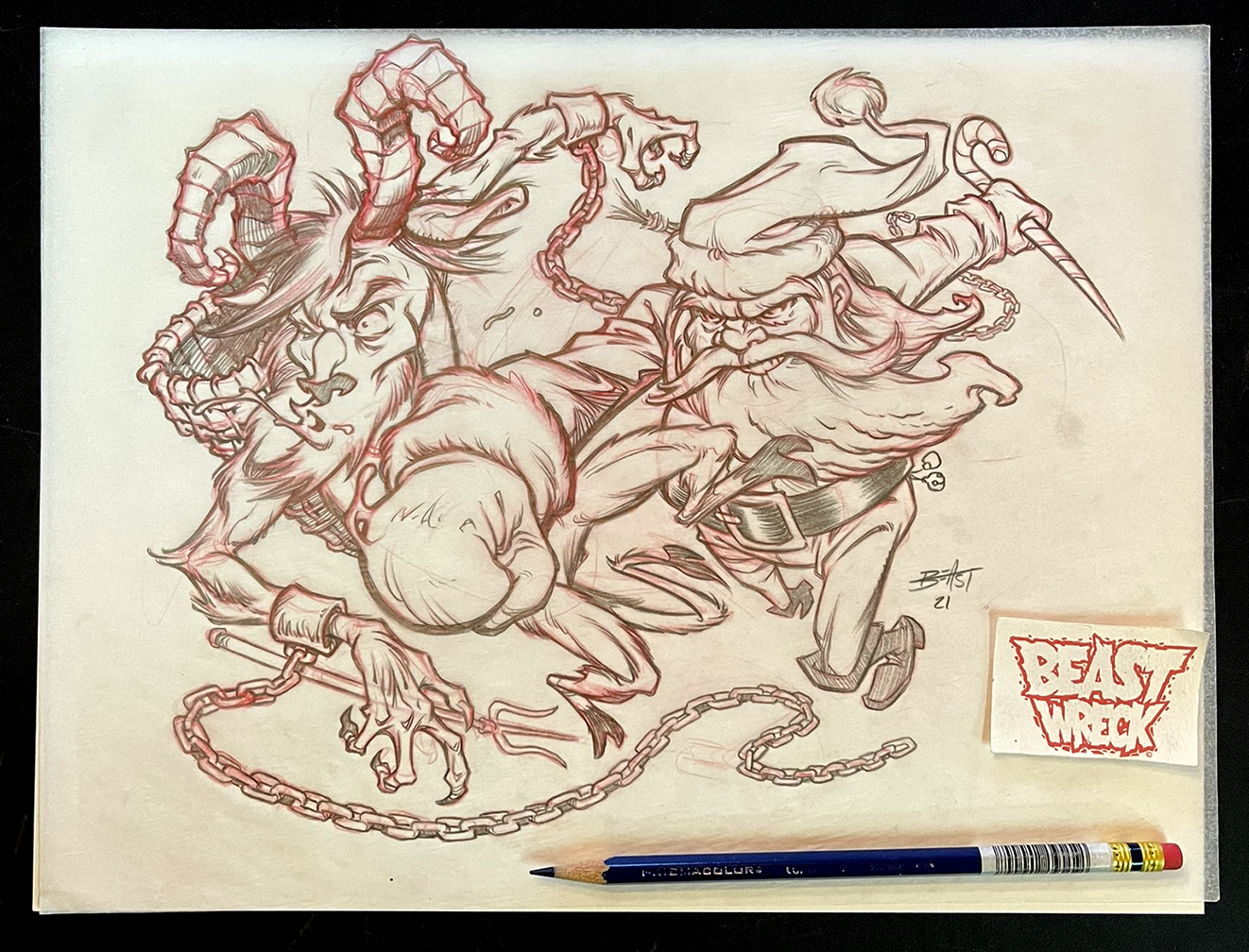 Original FINAL PENCIL DRAWING or ROUGH PENCIL DRAWING done in 2021 for Beastwreck's annual SANTA VS KRAMPUS drawing.
