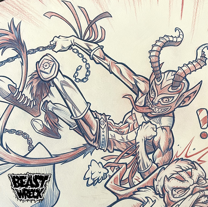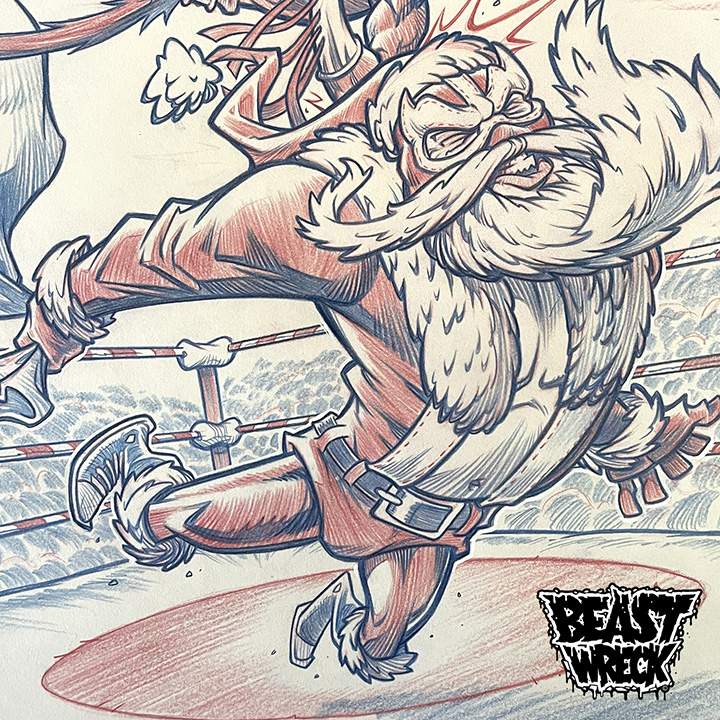 Original FINAL PENCIL DRAWING of "SANTOS VS LUCHAKRAMPUS" done in 2024 for Beastwreck's annual SANTA VS KRAMPUS drawing.