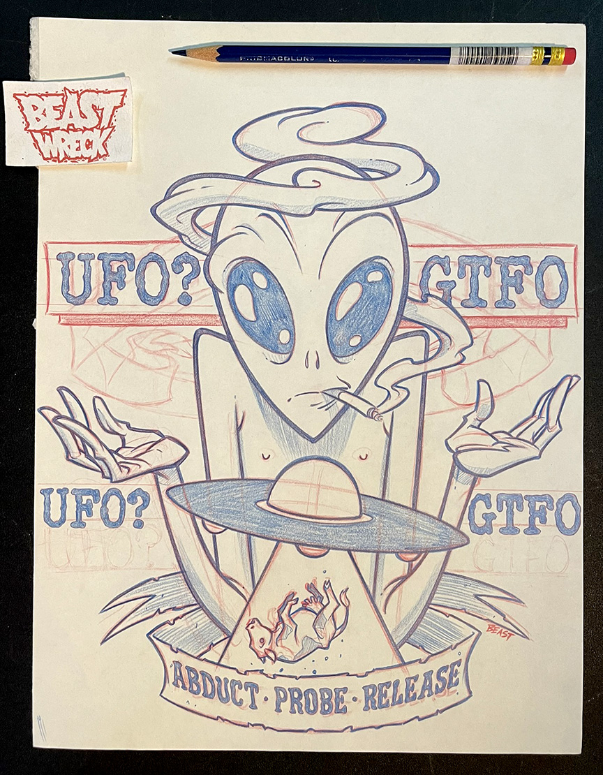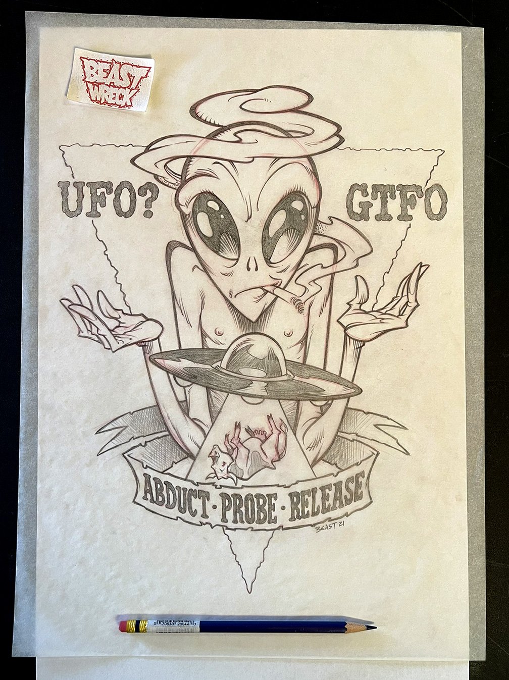 Original pencil artwork by BeastBoy for a BeastWreck t-shirt & Sticker design from 2017