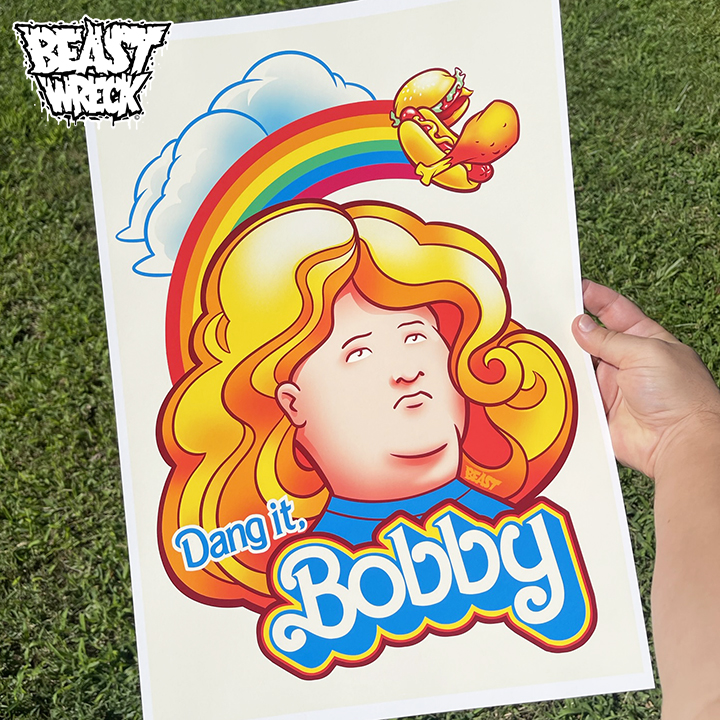 Digital print of the DANG IT, BOBBY design by BeastBoy, printed using a Canon Pixma iP8720 large format printer on 13" x 19" or 8.5"x11" Ultra Premium Archival Matte Presentation paper.