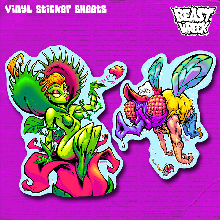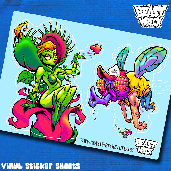 This 2-sticker set features a sensual botanic temptress luring her latest victim. I don't think this will end well for our poor redneck fly friend ! Two 4" die-cut stickers on one sticker sheet!