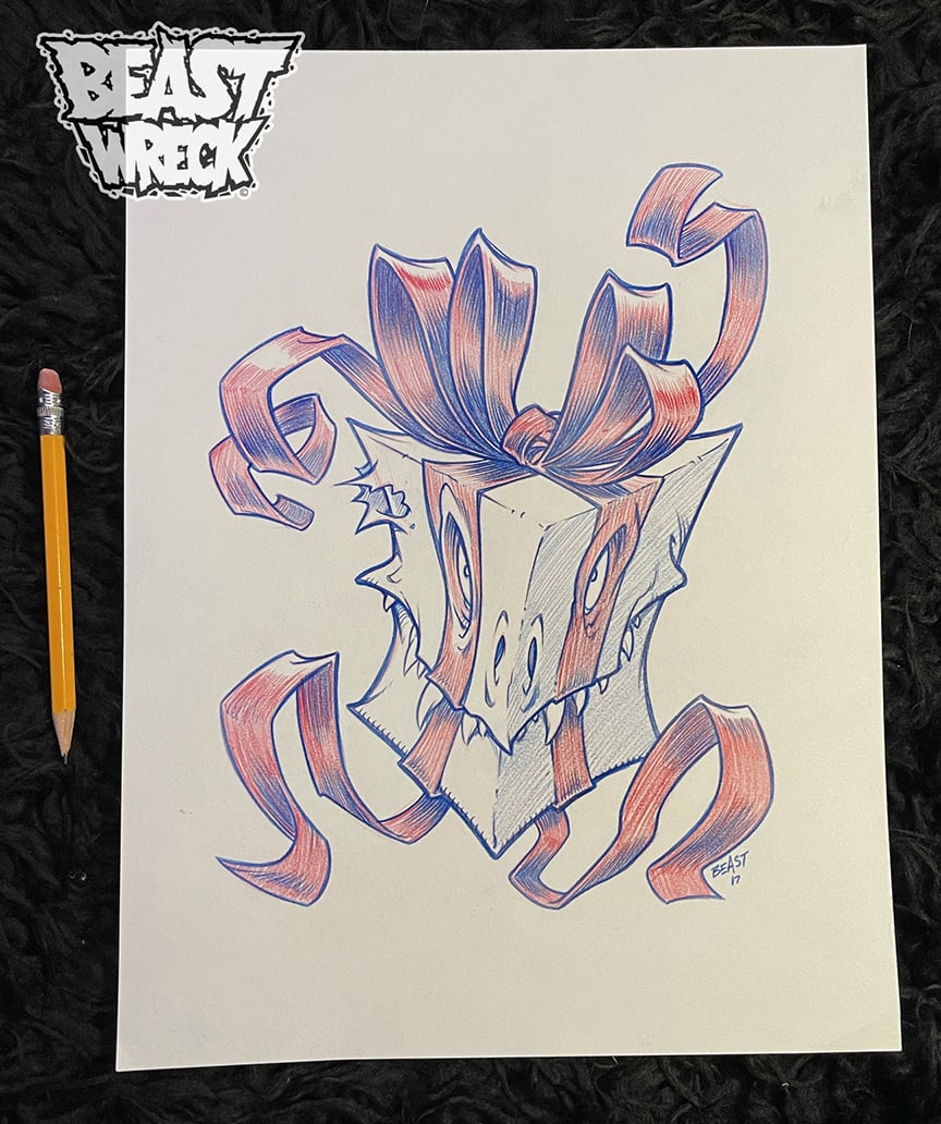 Original pencil drawing of one of my MONSTER PRESENT illustrations in colored pencil on 9" x 12" Strathmore Drawing paper.