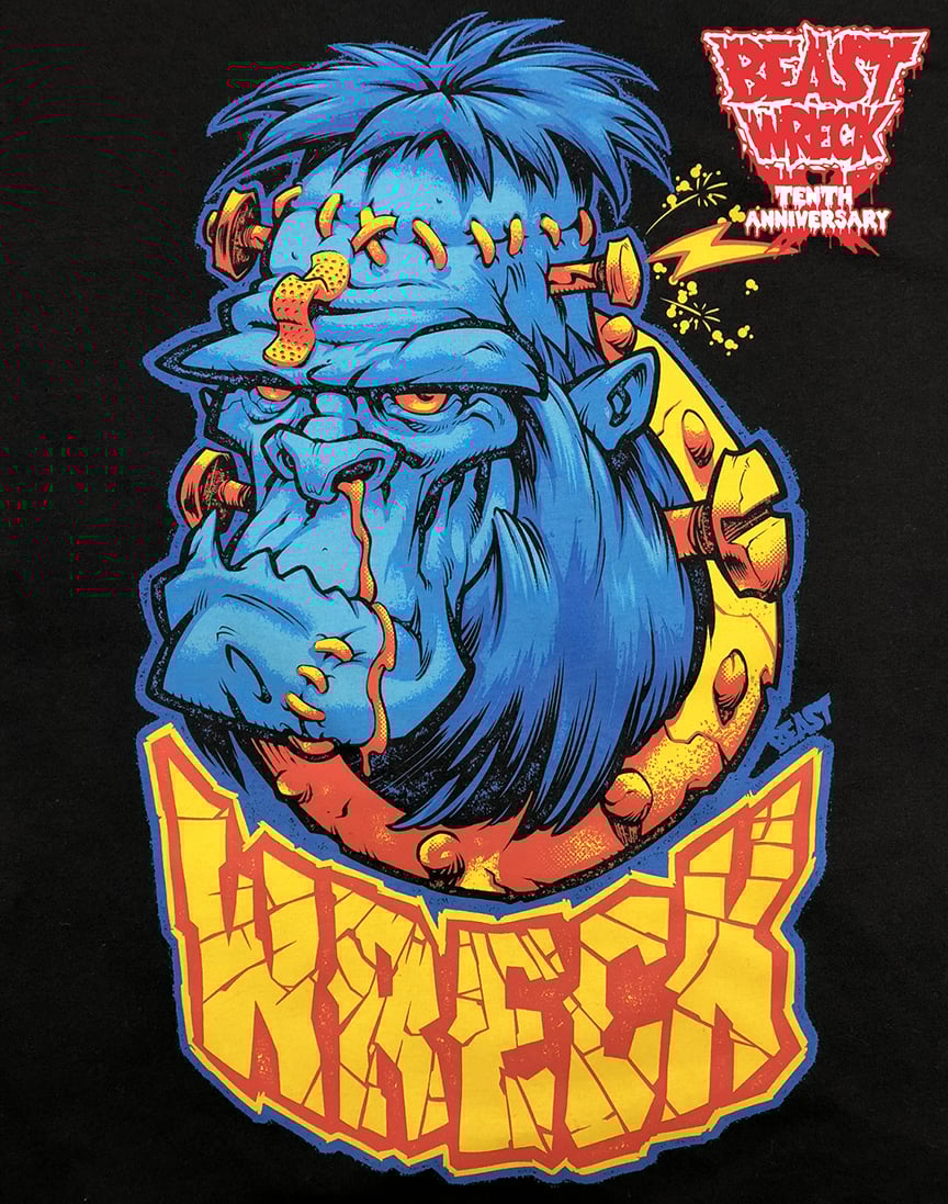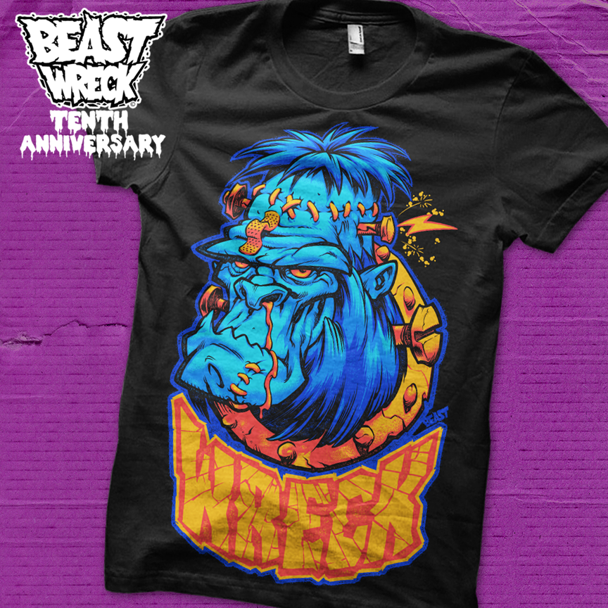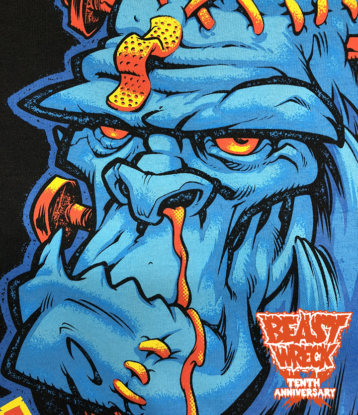 A wild revamped homage to one of BeastWreck's very first T-shirts returns in this new 10th Anniversary version! This bloodied gorilla is bruised but never beaten. It's WRECKIN' TIME!